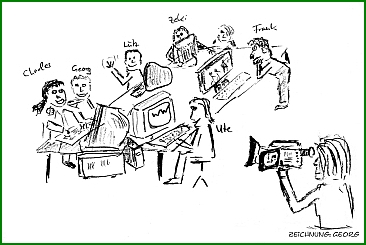 Medienfachleute, Jugendliche der Medienprojekte der Kunstschule, professionell betreut von Charles Wesseler, den Informatikern Zeki Minareci, Lutz Müller und Frank Hembach und dem Journalisten Georg Lembeck, bieten an miteinander vernetzten Computern Bild- und Filmbearbeitung an.